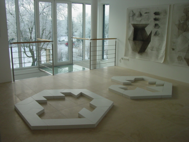Das Werk von Anna Recker hat etwas Magisches. Die geometrischen Formen, mit denen sie vorzugsweise arbeitet, zeigen, einmal zur Sichtbarkeit gebracht, den Drang, über alles Definierte und mathematisch Eindeutige hinauszugehen, sich zu entwickeln und dabei zu verwandeln. Ausgehend von schlichten konstruktiven Figuren – Spiralen, regelmäßigen Dreiecken und Sechsecken etwa – und mit einfachen Anordnungsregeln operierend wie zum Beispiel kreisförmigen Reihungen, durchlaufen diese Formen zahlreiche und unerwartete Metamorphosen. Aus einer Abfolge von linearen Schemata treten durch Hinzufügung von Schatten plötzlich gezeichnete Körper hervor, wie in Verwandlungsträumen werden aus diesen steinerne Artefakte oder offene Landschaften; aus Sechsecken wachsen komplexe Hohlkörper, Waben, archaische Irrgärten. Oder die gezeichneten Mutationen springen in die dreidimensionale Realwelt über und werden zu Objekten wie aus Stein geschnittenen Platten, modularen Dreiecksformen bespannter Leinwände, oder es entstehen hölzerne Bauteile, die sich immer neu anordnen lassen. Anna Reckers Kunstwerke bilden eine eigene ars combinatoria, sie sind analytisch-synthetische Meditationen über die inneren Eigenschaften geometrischer Formen und zugleich Studien zu unserer gedanklichen, sinnlichen und emotionalen Auffassung der elementaren Raum- und Weltverhältnisse.