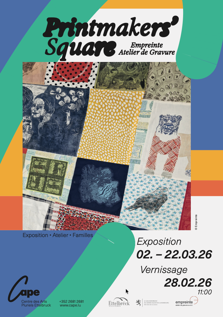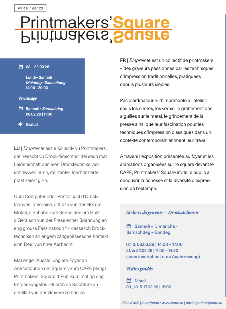 Empreinte ass e Kollektiv vu Printmakers, dat heescht vu Drockkënschtler, déi sech mat Leidenschaft den alen Drocktechnike verschriwwen hunn, déi zanter Joerhonnerte praktizéiert ginn. Ouni Computer oder Printer, just d’Drockfaarwen, d’Vernise, d’Kraze vun der Nol um Metall, d’Schabe vum Schneiden am Holz, d’Geräisch vun der Press ënner Spannung an eng grouss Faszinatioun fir klassesch Drocktechniken an engem zäitgenëssesche Kontext sinn Deel vun hirer Aarbecht. Am Zentrum vum kreative Prozess steet d’Matrice aus Koffer, Holz oder Lino: Si dréit d’Linnen an d’Flächen, déi d’Bild erginn. Pointe sèche, Eau forte, Aquatinte, Mezzotinto, Holzschnëtt – all Technik huet e geheimnisvolle Numm! Mat enger Ausstellung am Foyer an Animatiounen um Square virum CAPE plangt Printmakers’ Square d’Publikum mat op eng Entdeckungstour duerch de Räich-tum an d’Villfalt vun der Gravure ze huelen.